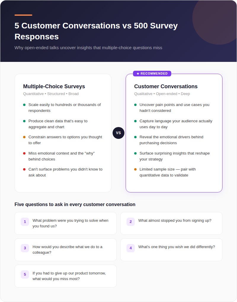 Surveys are useful but limited. Multiple-choice questions give you quantitative data, but they constrain people to the answers you thought to offer. The insights that change your strategy usually come from things you didn't think to ask about.