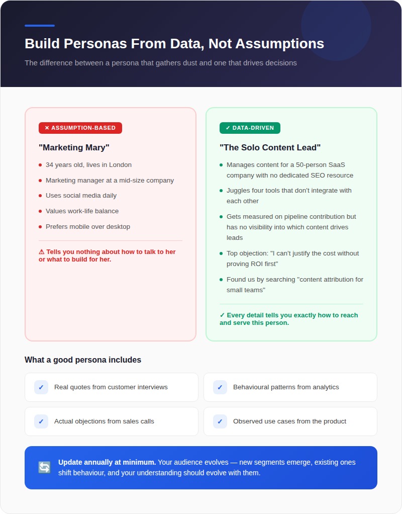 Good personas include real quotes from customer interviews, not invented ones. Real behavioural patterns from analytics, not assumed ones. Real objections from sales calls, not guesses. Real use cases observed in the product, not imagined workflows.
