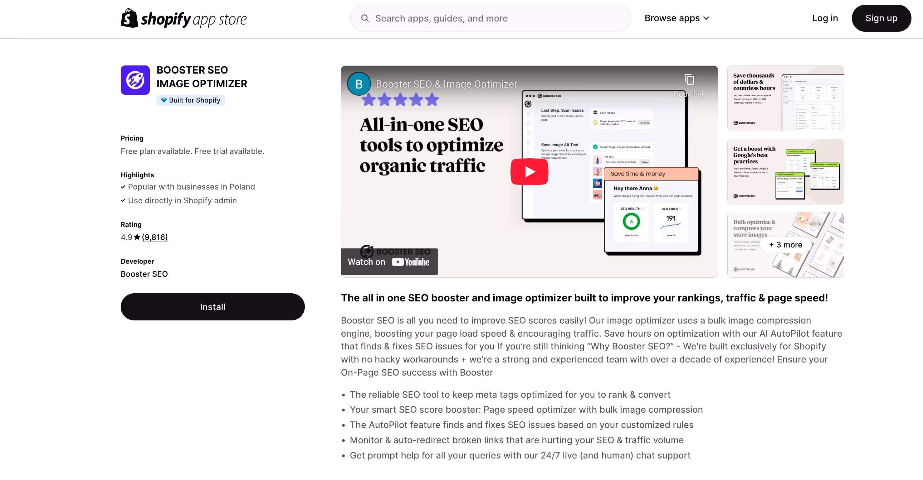 BOOSTER is designed for Shopify merchants aiming to improve search rankings and site performance through image optimization and SEO automation. Its audience includes stores prioritizing technical performance.